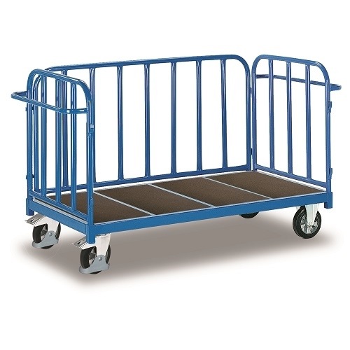 Wózek magazynowy do sterowania ręcznego, zwiększaja komfort pracy na magazynie, w skepie budowlanym czy centrum logistycznym. Blat wykonany ze sklejki antypoślizgowej oraz trzy mocne burty zwiększają stabilność transportowanego ładunku. Zamontowany hamulec i osłony ochronne są dodatkowym zabezpieczeniem. Pojazd pochodzi z oferty firmy VARIOfit®, specjalizującej się w produkcji nowoczesnych systemów transportowych.